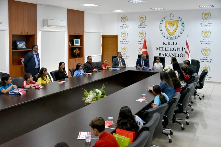 Atatürk İlkokulu Müdürü Ayşe Ertürk Şan başkanlığındaki öğrenci heyeti, Milli Eğitim Bakanı Nazım Çavuşoğlu’nu makamında ziyaret etti.