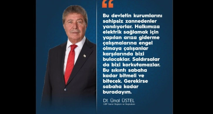 Başbakan Ünal Üstel, basına açıklamalarda bulundu. Ülkede üç gündür devam eden elektrik kesintilerine dikkat çeken Üstel, “Elektrik kesintilerinin sebebini araştırmak için arkadaşlarımızı görevlendirdik; ancak bir türlü çözüm üretemediler. Bugün biz devreye girdik” dedi.