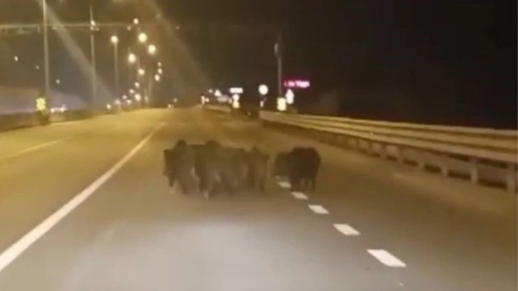 Mudanya ilçesi Mudanya Yolu üzerinde hızla seyreden otomobiller, yol üzerindeki karaltıyı görünce yavaşlamak zorunda kaldı. Cadde üzerine çıkan çok sayıda irilik ufaklı domuz, bir süre sağ şeridi işgal etti. Kaza yapmaktan son anda kurtulan otomobildekiler, cep telefonu kameralarıyla o anları saniye saniye kaydetti.