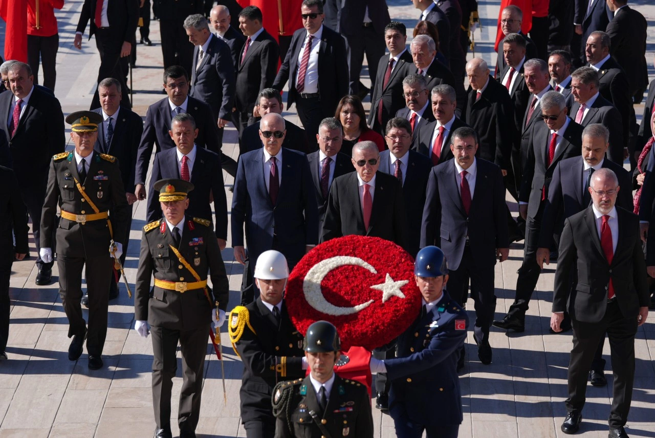 TC Cumhurbaşkanı Erdoğan'ın, üzerinde ay yıldız bulunan çelengi Atatürk'ün mozolesine bırakmasının ardından saygı duruşunda bulunuldu ve İstiklal Marşı okundu.