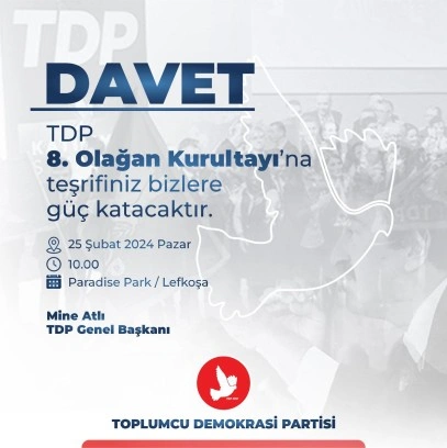 Toplumcu Demokrasi Partisi’nin (TDP) 8. Olağan Kurultayı yarın yapılacak. TDP’den yapılan açıklamaya göre, Kurultay Lefkoşa’da The Paradise Park’ta saat 10.00’da başlayacak.