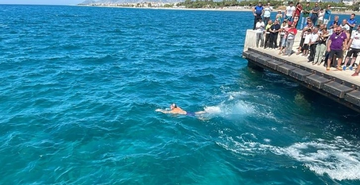 Eski Devlet Bakanı Kürşad Tüzmen ve 7 sporcu, hazırlıkların ardından iskeleden denize girdi.