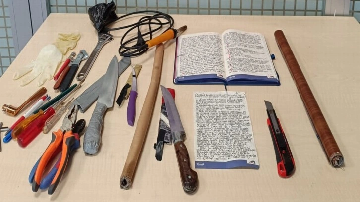 Şüphelinin yanında bulunan çantada ise 3 adet bıçak, 1 adet falçata, 1 çift plastik eldiven ve kapı açmak için kullanılan aletler ele geçirildi.