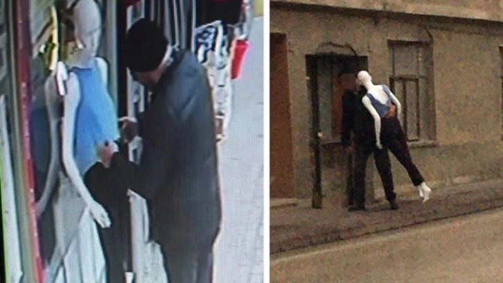 Bursa'nın İnegöl ilçesinde bir şahsın bir işyerinin önünde bulunan cansız mankeni dakikalarca sevdikten sonra kucaklayıp kaçırdığı anlar güvenlik kamerasına yansıdı.