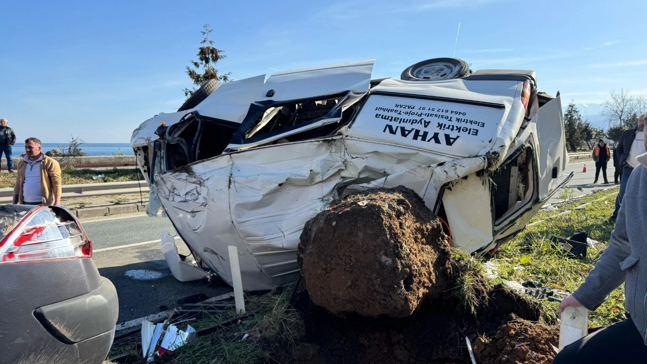 Rize’den Trabzon yönüne ilerleyen plakası ve sürücüsünün kimliği belirlenemeyen minibüsün aynı yöndeki otomobile çarptı. Araçlar, refüje çarpıp takla attı.