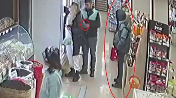 Polisin şüphelileri takip anları ve bir şüphelinin markette kadının çantasından cüzdan ve cep telefonu çalması ise kameraya yansıdı.