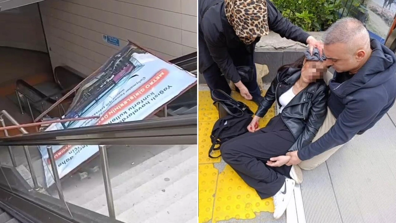 Görüntülerde, reklam panosunun yolcuların yürüyen merdiveni kullandığı sırada düştüğü görülüyor.