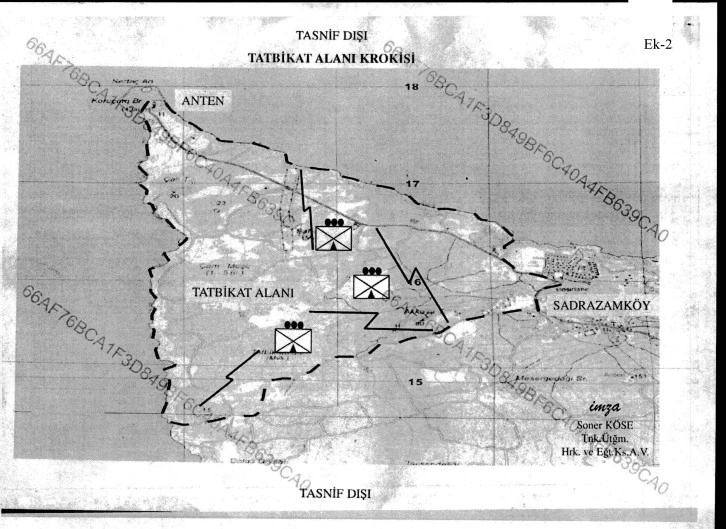 Açıklamada, tatbikat bölgesinin, “Batıda; Koruçam burnu sahil yolu, doğuda; Sadrazamköy batısındaki asfalt yol ile tatil köyü arasındaki yolun batı hattı, kuzeyde; Anten/Deniz Feneri ile tatil köyüne kadar olan sahil boyu ve denizde 10 km’lik alan, güneyde; Sadrazamköy ile batı uzanımı hattının denize kadar uzanan yolun kuzeyi arasında kalan bölge” olduğu belirtildi.
