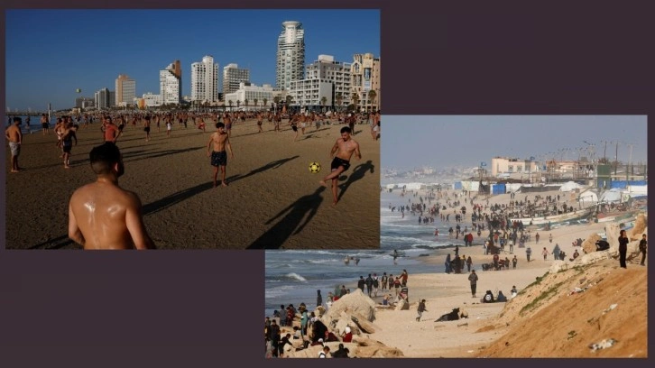 Öte yandan, bu karelerin çekildiği Tel-Aviv'den sadece 70 kilometre uzaklıktaki Gazze'de ise plajlar adeta savaş yerine dönmüş durumda.